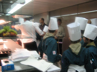We were then taken to the Kitchens, given aprons and hats to help prepare lunch. We were put into three groups. My group started by making pizzas. We were given a piece of dough, some tomato sauce, cheese(!) and various toppings and the assistance of a Chef. Next we made pancakes with the Executive Chef and his apprentice. The heat coming off the range was almost unbearable, and the frying pans got so hot we had to hold them with the corner of our aprons! Our final activity was making chocolate truffles and decorating mini chocolate cakes. Needless to say, this was the messiest, and most enjoyable, task!